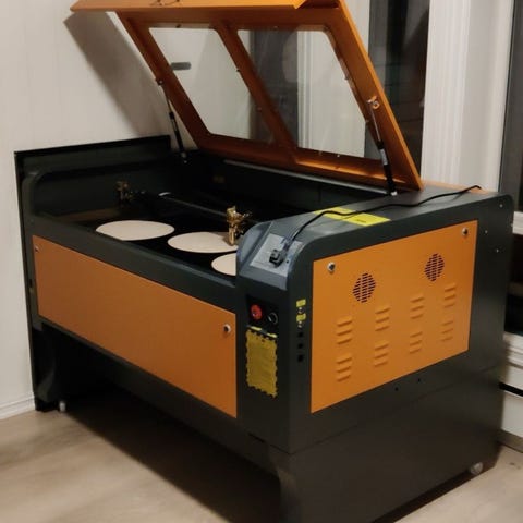 Laserpecker lasergraveringsmaskin med oransje beskyttelsesdeksel og svart base. Utstyrt med USB-tilkobling og LED-indikator for driftstilstand. Maskinen er egnet for gravering på ulike materialer og har en arbeidsflate med mål tilpasset mindre prosjekter. https://youtu.be/k0nGkIO7StY?si=FPzj7kW8hXdDh4dS