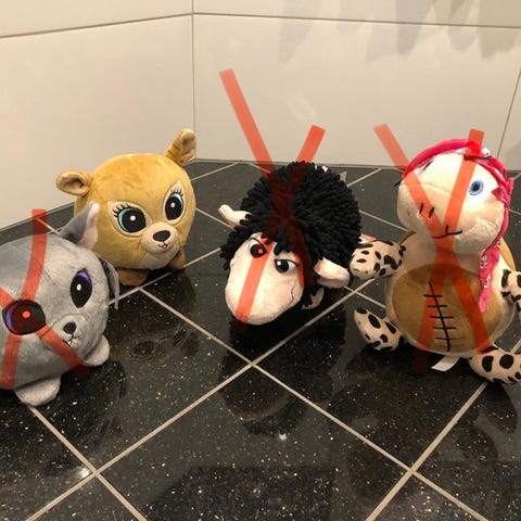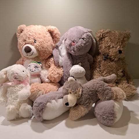 Flere forskjellige bamser og kosedyr i ulike størrelser og farger. Da har sittet på en hylle i barnerommet og vært brukt. Fremstår som nye. Materialene er myke tekstiler egnet for barn. Passer som leker eller dekorasjon.