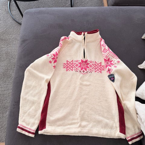 Klassisk og tidlaus ullgenser frå Dale of Norway i storleik small. Genseren har tradisjonelt mønster i svart, kvitt og raudt, og er laga i varm og behageleg ull av høg kvalitet.