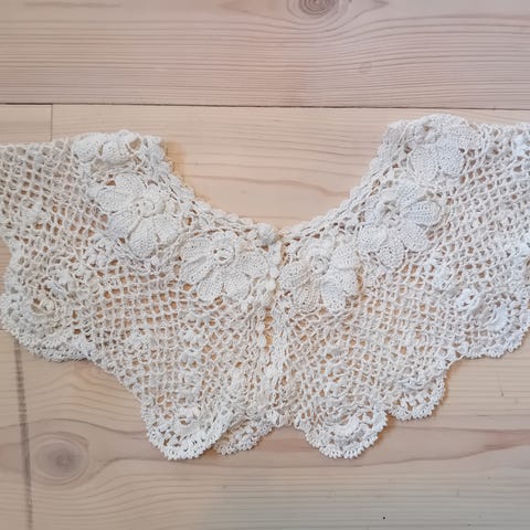 Heklet krage til pynt. Lengde ca. 38. Indre del av krage. Bredde 6,5 cm.