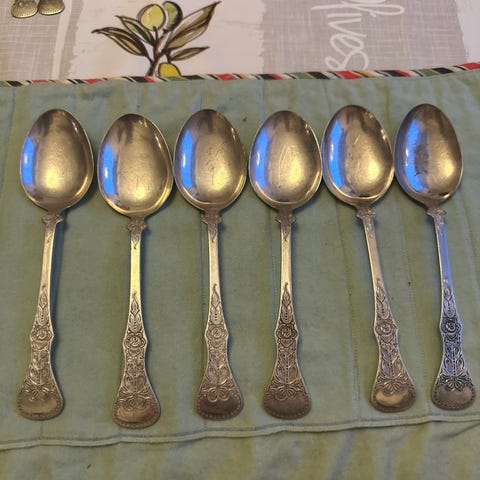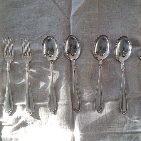 12 gafler og 12 spiseskjeer merket NM 60. Pent og lite brukt. Leveres i bestikklommer