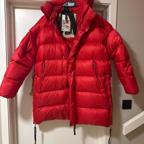 Selger min oversized CAYA Ginny jakke i en nydelig rød farge, come as you are, dun jakke, medium lang med mange tøffe detaljer i str small. Jakken er maksimalt brukt 3-4 ganger og fremstår uten slitasje eller skader.