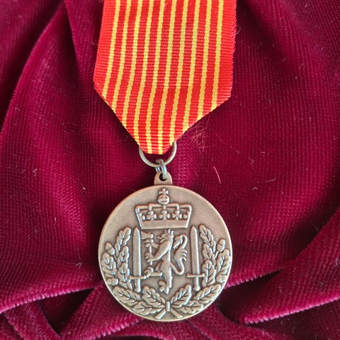 Fortjeneste medalje , gammel ,mest sansynelig innen idrett , samleobjekt , meget pen med feilfri emalje på metall og originalt rødt bånd.