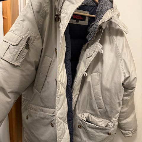 Vurderer å selge denne varme og gode dunparkasen da den ligger til pynt i skapet. Brukt ca 1 uke i 2016, og ellers bare ved ett par anledninger etterpå det. Størrelse herre S, og jeg er ca 165cm og den var stor og god til meg. Sortfargen er litt falmet, men ellers er jakken god som ny og i tipp topp stand. Perfekt for de kaldeste vinterturene og om du kjører hundeslede. Store gode lommer, stor hette med pelskrage som beskytter godt mot vær og vind. Beste og varmeste dunjakken, men da jeg ikke er på denne typen turer synes jeg nesten det er for gale å ha den liggende i skapet. Vurderer derfor om jeg skal selge den. Jakken har mitt navn sydd på, da jeg var med på Fjellreven Polar i 2016. Det tenker jeg man lett kan få tak i ett merke og sette over om man vil. Se spesifikasjoner på de siste bildene hentet fra nett. Nypris ligger på ca 10100kr på f.eks naturkompaniet, Vurderes solgt for 6500kr.