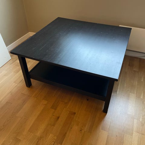 Godt brukt stuebord fra IKEA, heltre, mangler hylleplaten under, men fungerer helt fint. Stødig, synlige bruksmerker på overflaten, brukt til Lego-bygging i kjellerstuen av ungene de siste årene. Kan pusses ned om man vil freske det opp.