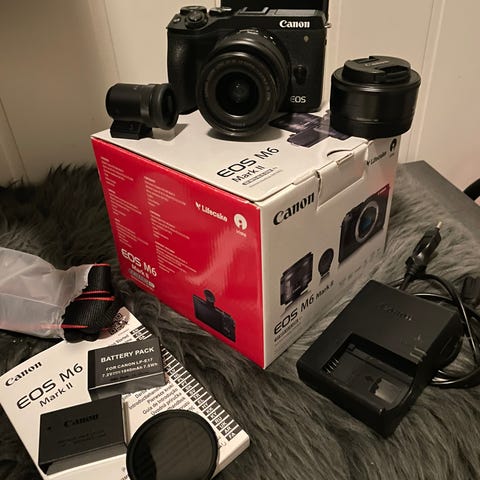 Canon EOS M6 mark II, svært pent brukt. speilløst kamera med 15-45mm objektiv, reim, lader, ett batteri og i original eske med instruksjonsmanual. Det medfølger også