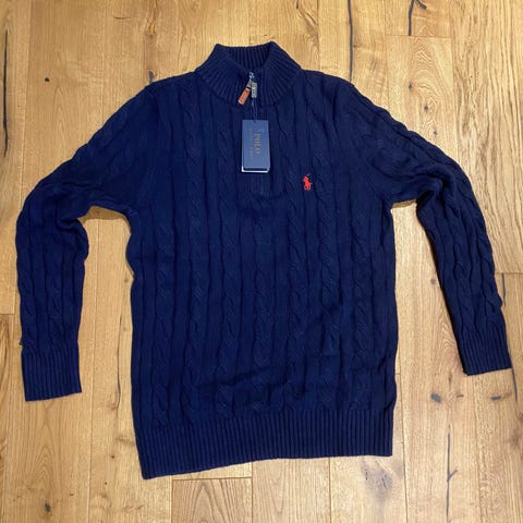 Ralph Lauren genser str. XS. Blå farge med glidelås i halsen og kabelstrikket mønster.