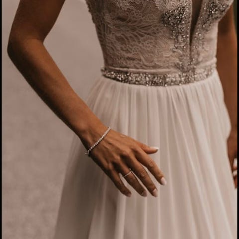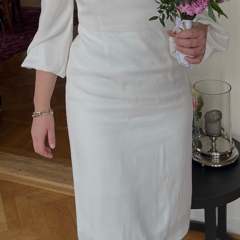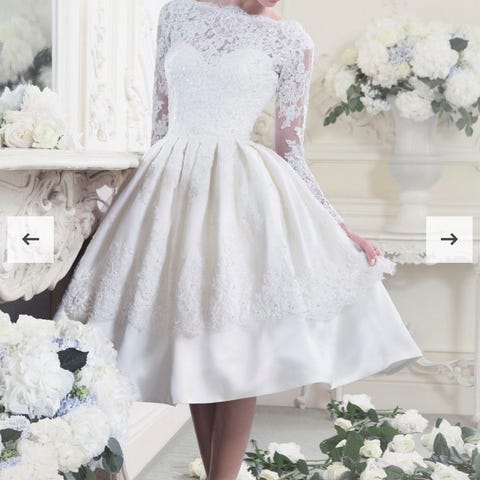 Selger en flott brudekjole str m i 50/60 talls vintage stil som vekker oppsikt. Fjærboa og hodepynt kan følge med for 1500kr. Merke på kjolen er Ellis Bridal London.
