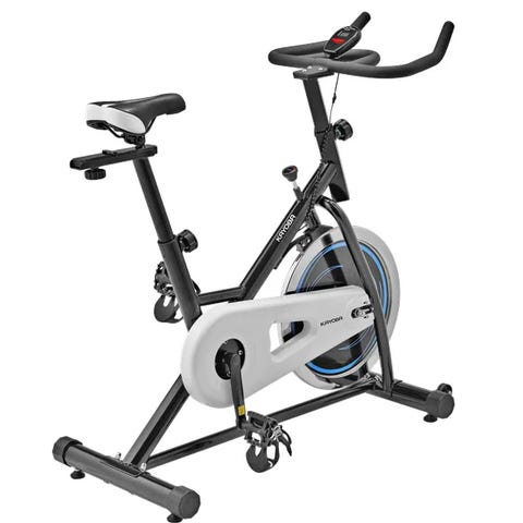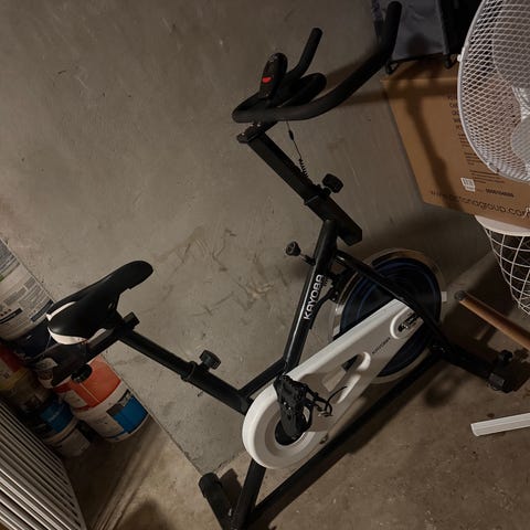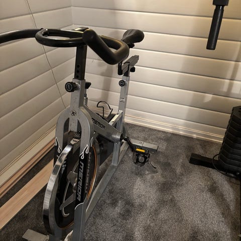 Nordic Spinningsykkel innendørs treningssykkel med justerbart sete og styre, pedal med reim, og solid ramme i metall. Slitasje og noe kosmetiske feil.
