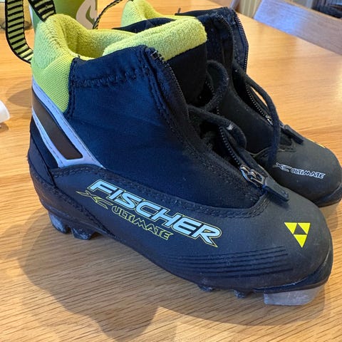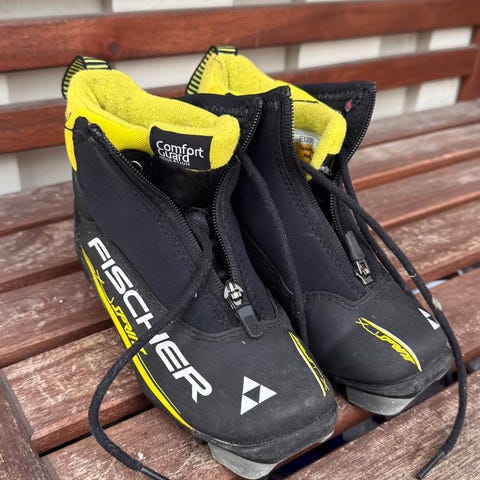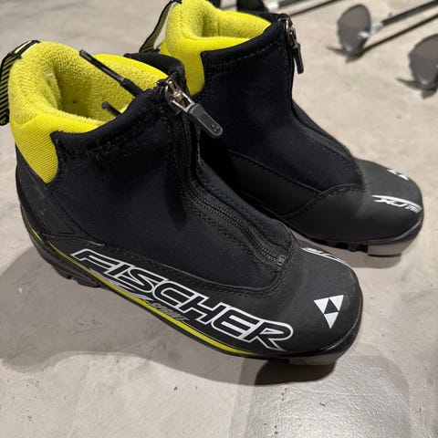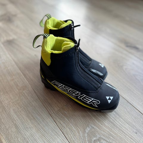Fischer skisko i størrelse 30 med svart og gul farge. Skiskoen har glidelås foran.