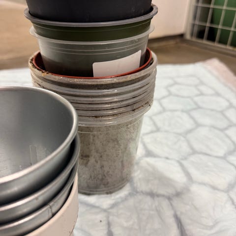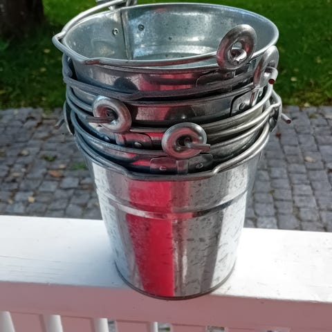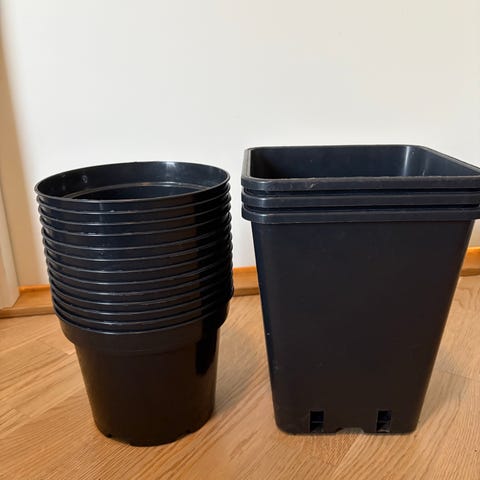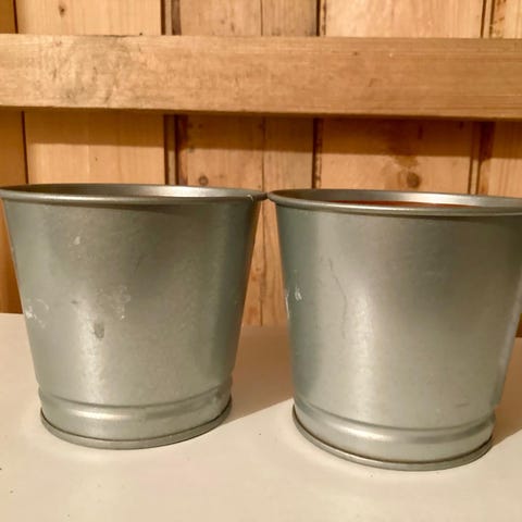 Sorte potter i metall med en diameter på 10 cm. Egnet for innendørs bruk til planter og dekorasjon. 20 stk, ubrukt og 19 av de fortsatt pakket inn i originalt papir. Kan brukes som blomsterpotte, til urter, oppbevaring av små ting eller som innlegg i større potter. Kan også selges for 10kr per stykk om du ikke trenger alle.