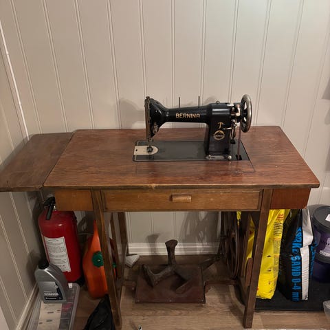 Dekorativ symaskin med håndsvei, med tilhørende lokk i tre. Fullt fungerende.