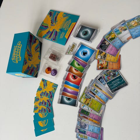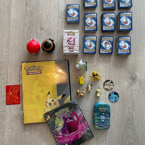 Har satt sammen fire bokser fulle av pokemonkort og diverse tilbehør. Hver boks inneholder 130 vanlige pokemonkort, 15 glinskort og 5 ex kort. Totalt 150 kort . I tillegg er det lagt ved et tilfeldig full art kort fra bilde 6. I tillegg til kortene inneholder hver boks: