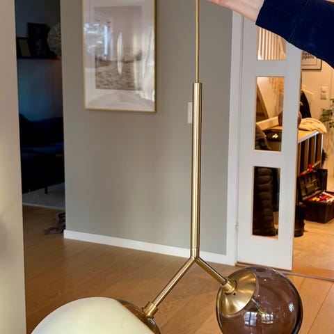 Flott pendel fra House Doctor. Modellen heter Twice, koster 2400 kr ny. Stang i messing og kuler i røykgrått glass og opalhvit.