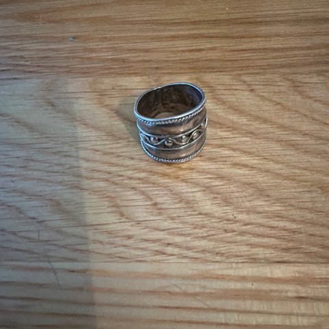 Sølv ring i sølv, designet for unisex bruk. Ringen har en bredde med et mønster av små sirkler og en åpen justerbar form. Materialet er sølv, og ringen leveres i en grønn fløyelsboks.