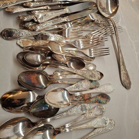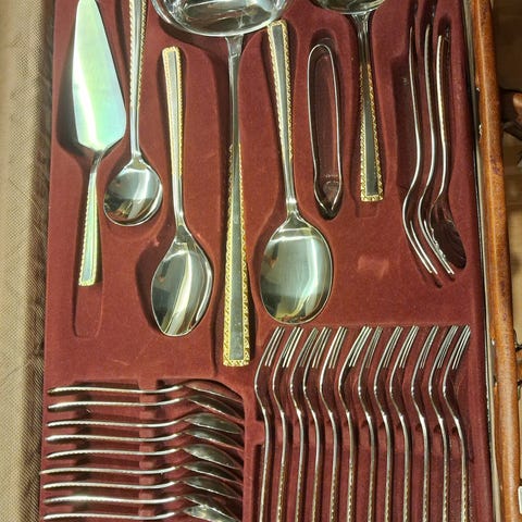 70 delers bestikk fra SBS, tysk kvalitet fra Solingen. Rustfritt edelstål med gullforgylt kant/dekorering. Mangler 1 teskje og 1 liten gaffel. Tåler maskinvask. Modellen heter 'Berlin' / 4520. Til 12 personer. Kun bestikk uten oppbevaring.