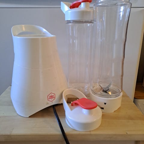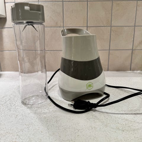 OBH Nordica Smoothie blender i oransje farge. Inkluderer blenderbase med strømkabel og en gjennomsiktig plastkanne med lokk. Egnet for å lage smoothies og andre blendede drikker.