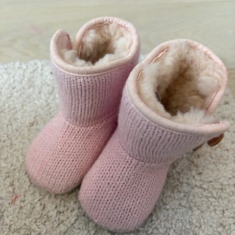 UGG barnestøvler i gullfarge, størrelse 18. Støvlene har myk og varmt skinn/ullfôr på innsiden, og en dekorativ sløyfe bak. Egnet for små barn som trenger varme og komfortable sko. Pent brukt som tøfler/innesko/i vogna av et barn.