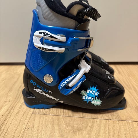 Dalbello Menace 2 alpinski støvler i størrelse 195. Støvlene har svart og blå farge med oransje detaljer. Lite brukt