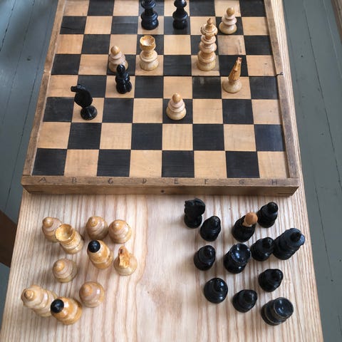 Fullt sett med brikker og sjakkbrett. Laget i tre, trolig for hånd i Afrika.