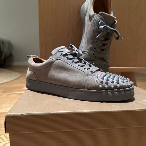 Christian Louboutin Sneakers joggesko i størrelse 43. Skoene er svarte med røde såler, laget i semsket skinn materiale. Kommer med boks og dustbag. Send dm om du lurer på noe.