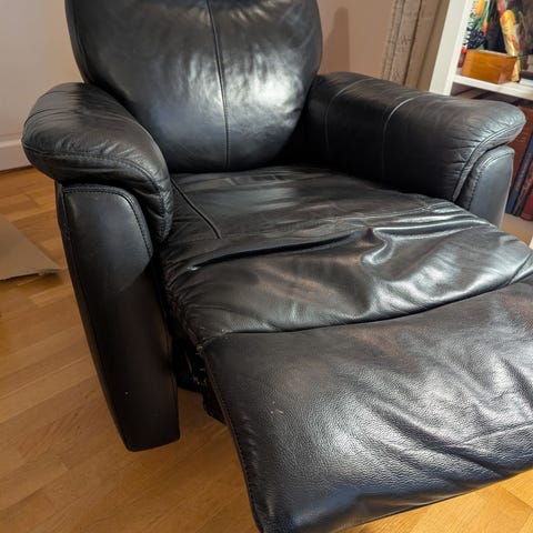 Brun recliner lenestol med trekk i mikrofiber. Stolen har polstrede armlener og ryggstøtte, samt en utfellbar fotstøtte. Passer for avslapning i stue eller andre oppholdsrom.