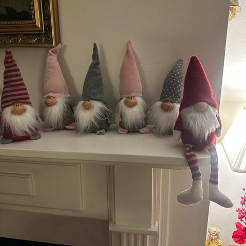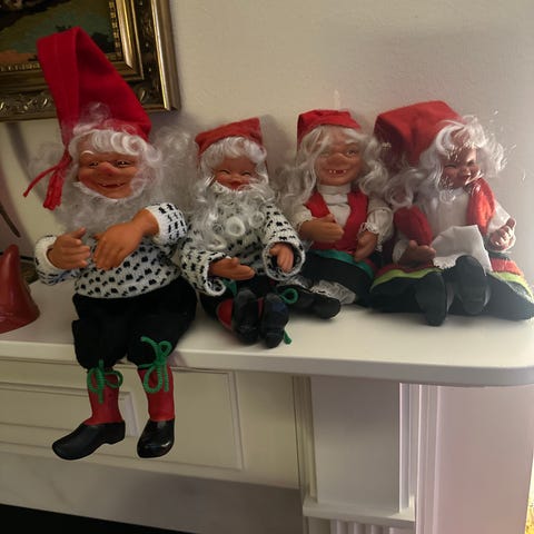 Fine nisser med rød og hvit farge, og fine detaljer. Figuren har langt krøllete skjegg, stripete lue og sokker, samt rød kåpe med hvite detaljer. Høyde ca 50 cm. Selges samlet