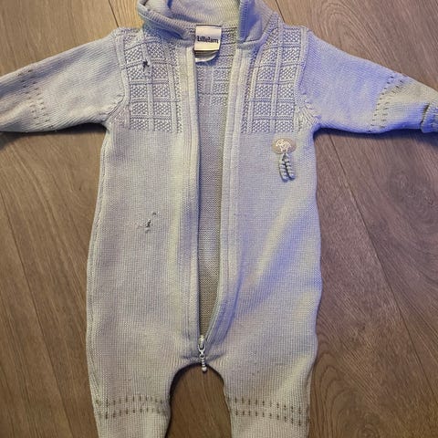 Lillelam ullsparkdrakt/ ulldress i størrelse 74. Laget av merinoull med lys blå farge. Sparkedrakten har glidelås foran og en krage, egnet for å holde barnet varmt. Nyvasket med milo ullsåpe.