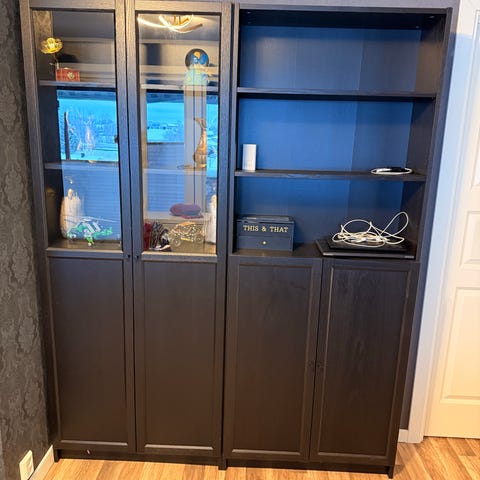 Selger sort eikemønstret vitrineskap fra IKEA. I god stand. Har hatt filtmatter i hyllene for å beskytte de. Se siste bilde for IKEA sin beskrivelse av skapet.