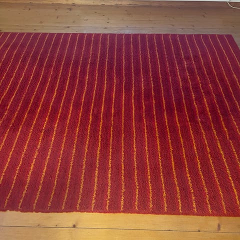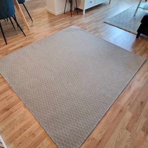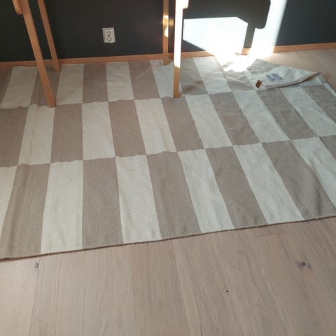 Er det kaldt på gulvet? Hva med en ull teppe i grått/sort/hvit? Utgått IKEA modell, finner ikke navn. Noen bruksmerker fra kontorstol men ingen flekker eller lukt. Dyr og røyk fritt hus.