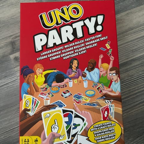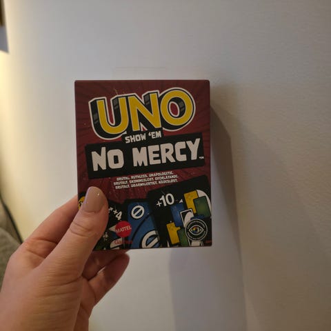 UNO No Mercy kortspill med tema "Show 'Em No Mercy". Inneholder spesialkort som gir ekstra utfordringer i spillet, inkludert +10 kort. Passer for spillere som ønsker en mer intens variant av det klassiske UNO-spillet.