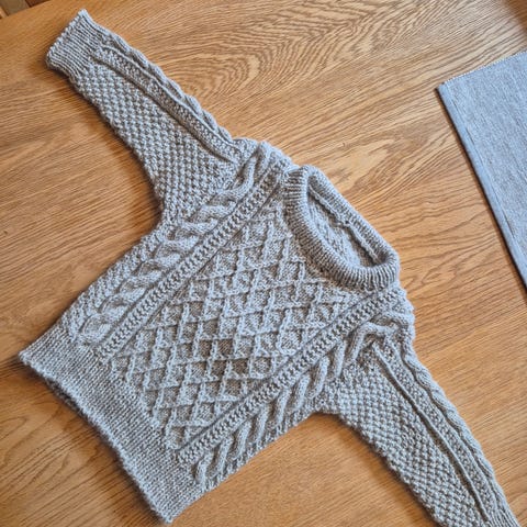 Hjemmestrikket Moby sweater fra Petite Knut til barn. Strikket i double sunday fra Sandnes garn i fargen eikenøtt