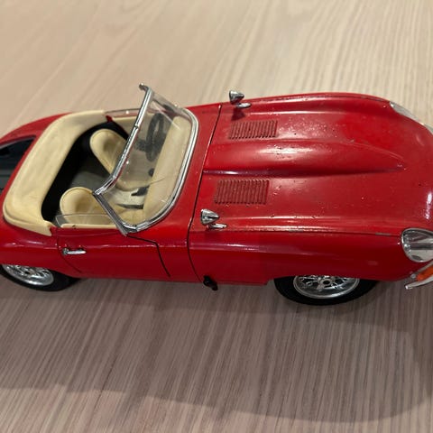 1961 Jaguar E-Type Cabriolet i rød farge med beige interiør. Detaljert modell med åpningsbar motorhjelm og realistiske felger. Passer som samleobjekt eller dekorasjon. 1:18 scala