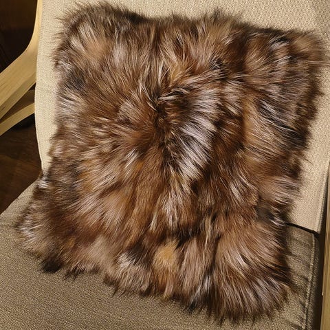 Dekorativ pelspute av rev, 50x50 cm. Tilvirket av buntmaker, lys/mørk farge.