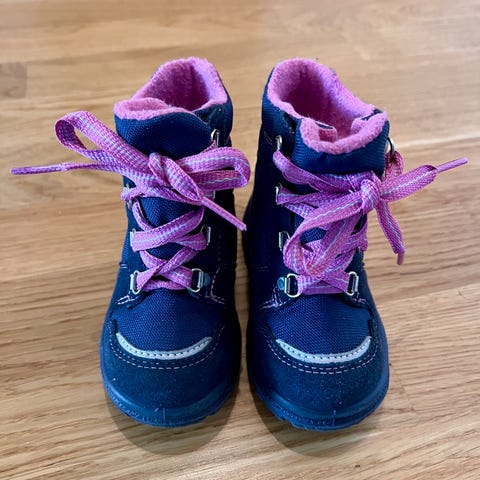 Støvlene er svarte og laget av slitesterkt materiale egnet for utelek i vått/kaldt vær.