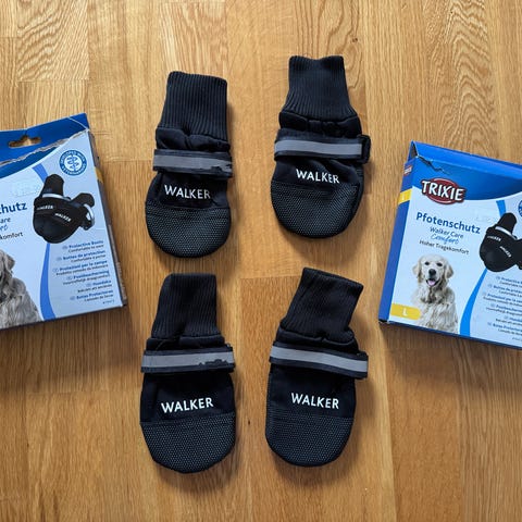 Selger 4 stk trixie sorte walker hundesko i størrelse S/M. Passer en på størrelse med jackrussel terrier. De ble for små til min hund. Aldri brukt. Kjøpt for 500 kr for kort tid siden hos ilovedogs.
