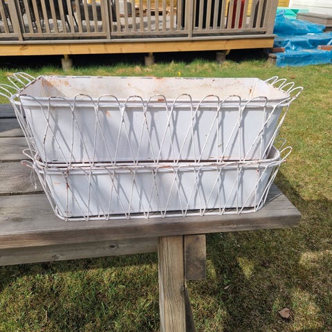 Disse to dekorative treplantekassene i shabby chic-stil har metallhåndtak og hjerteformede anheng.
