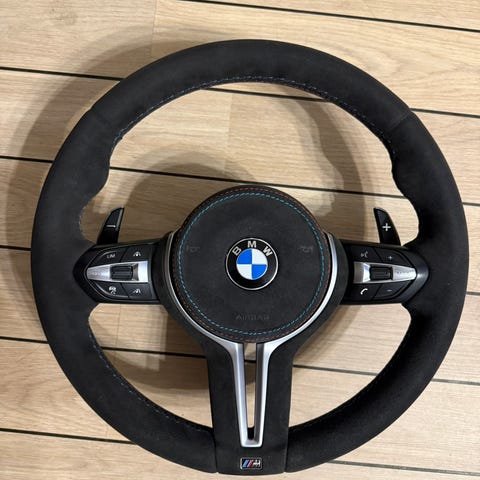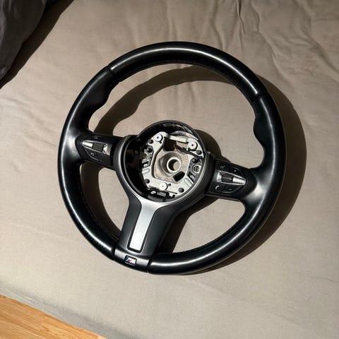 BMW M Sport ratt i svart skinn med integrerte girspaker. Rattet har multifunksjonsknapper og et sporty design tilpasset M Sport-modeller.