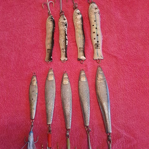 Selger samlet 6 nye og ubrukte sluker/pilker til sjøfiske. Det er, fra venstre på første bilde, tre stk. Kinetic Magic Herring 60g, en Abu Garcia Toby 28g, en Mitralite Ragot 40g og en rød/sort sluk på 40g.