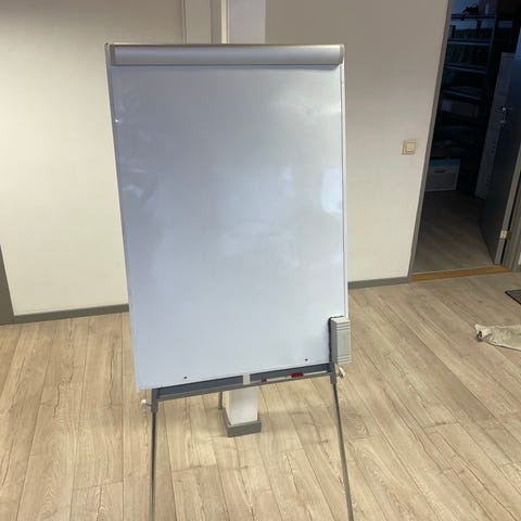 Manutan bærbart whiteboard på hjul med hvit overflate og justerbart stativ. Kan justere høyde og tilte platen. Det er ett flipover stativ med forlengelses armer.