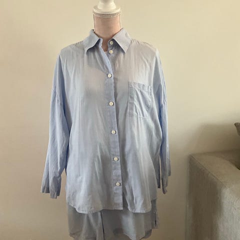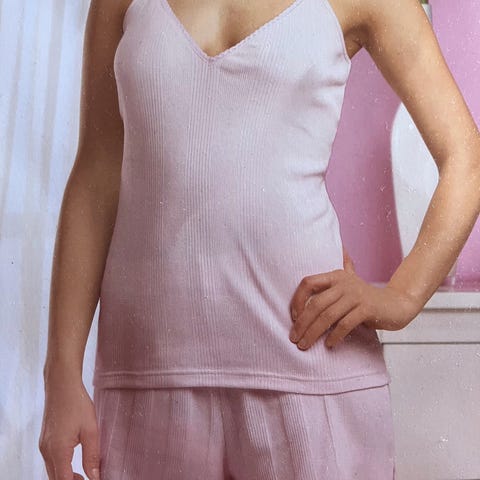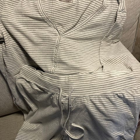 Myk og behagelig pysjamas i ribbestrikket bomull fra H&M. Sett med kortermet topp og bukse med snøring i livet. Veldig komfortabel – perfekt som pysjamas eller loungewear hjemme.