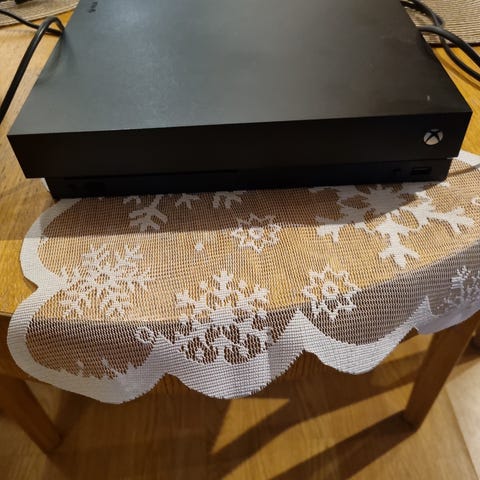 Xbox One konsoll i hvit farge med tilhørende hvit. Konsollen har flere tilkoblingsporter for ekstern tilkobling. Xboxen er som ny, det kjem ingen kontroll eller kabeln til kontrollen, men det kjem med kabler til Xboxen.