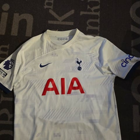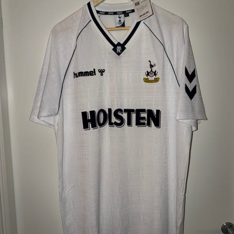 Selger en Tottenham Hotspurs bortedrakt fra 1994/1995 sesongen med Jürgen Klinsmann #18 bak på ryggen.