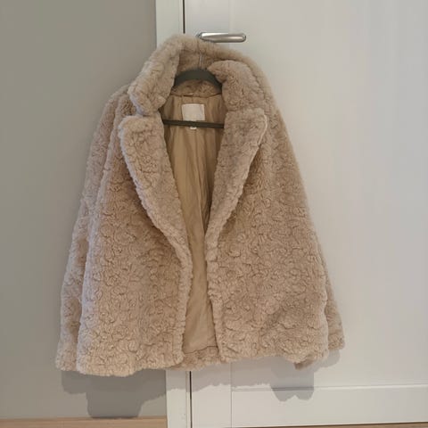 H&M Annet yttertøy i størrelse L for dame. Jakken er laget av fuskepelsmateriale og har hvit farge. Den har en myk og varm tekstur, egnet som yttertøy i kaldere vær.