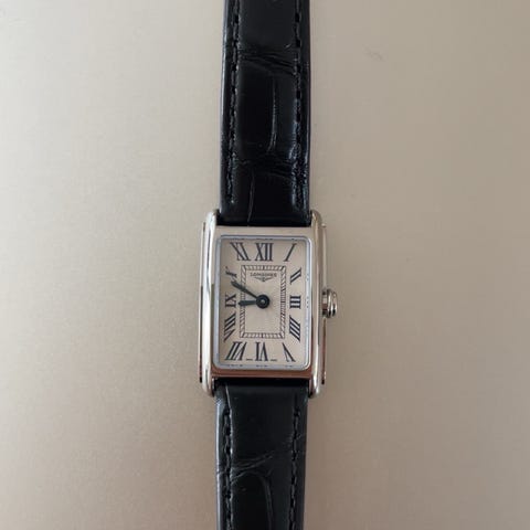 Selger en elegant Longines DolceVita, en ikonisk modell med rektangulær kasse og klassisk uttrykk. Dette er en klokke som balanserer dress og hverdagsbruk på en veldig fin måte.