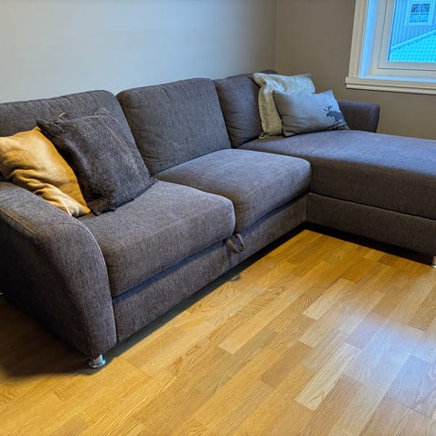 Jeg kjøpte denne sofaen i september på jysk for å ha den i stuen. Jeg syns den ble litt for liten og kjøpte en ny på finn i stedet.. Sofaen har siden stått "lagret" på kjøkkenet uten å ha blitt brukt. Den har kun vært prøvesittet.