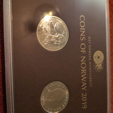 Det Norske Myntverket myntsett fra Norge, utgitt i 2014. Settet inneholder flere mynter med ulike motiver, presentert i en rød eske med informasjon om myntenes spesifikasjoner og vekt.
