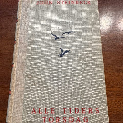 John Steinbeck - Alle tiders torsdag, en bok utgitt av Gyldendal Norsk Forlag i 1954. Boken er på norsk og har en teksturert omslag med illustrasjon av fugler på forsiden og ryggen. Originaltittel er "Sweet Thursday" og boken er trykt i Norge.