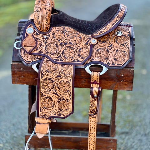 Denne salen er håndlaget i topp kvalitet lær, med ekte sheepskin-fôr og flott, detaljert tooled skin som ser fortsatt veldig bra ut
