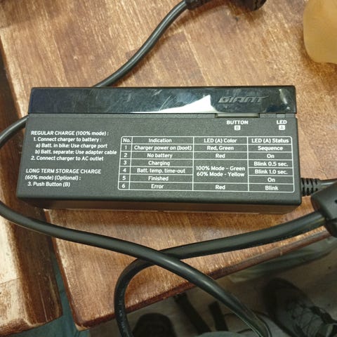 Giant lader til el-sykkel med spesifikasjoner for batterilading. Laderen har LED-indikatorer som viser ladestatus og mulige feil. Den er utstyrt med en kabel og kontakt for tilkobling til el-sykkelens batteri.
